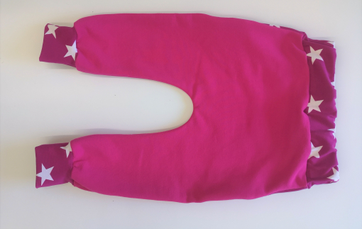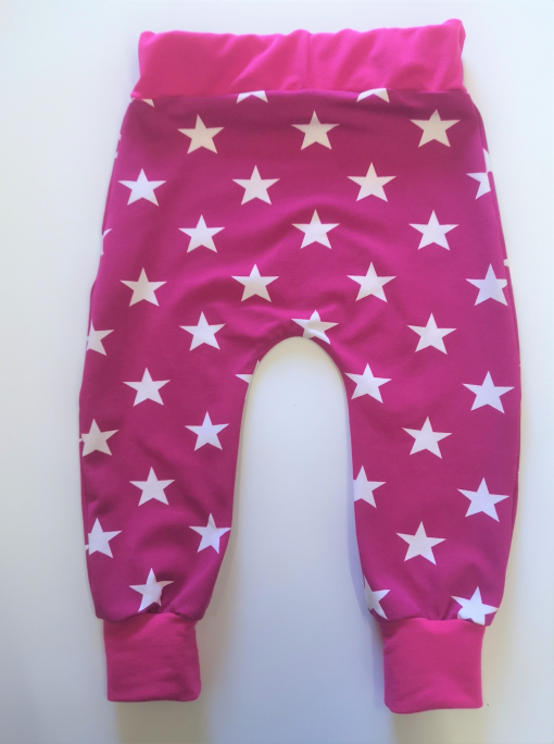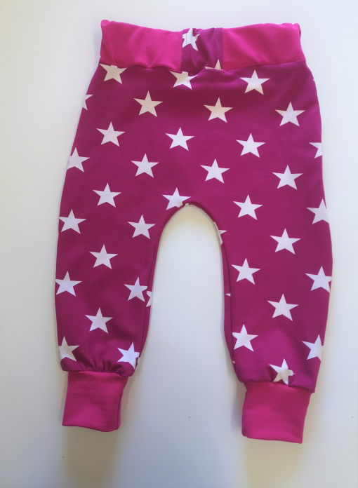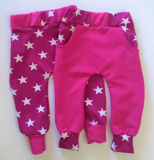 Otroške Baggy hlače iz bombažnega Jerseya in bombažne prevešanke. Hlače z zvezdicami so iz Jerseya. Enobarvne pa iz bombažne prevešanke. Številka baggy-ja je realna glede na višino otroka. Torej npr. št. 56 je za višino otroka nad 56 cm.