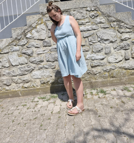 Izdelana je iz 100 % mehkega bombažnega muslina, ki diha z vašo kožo in zagotavlja maksimalno udobje skozi ves dan. Lahkotna tekstura tkanine daje obleki čudovit padec.