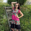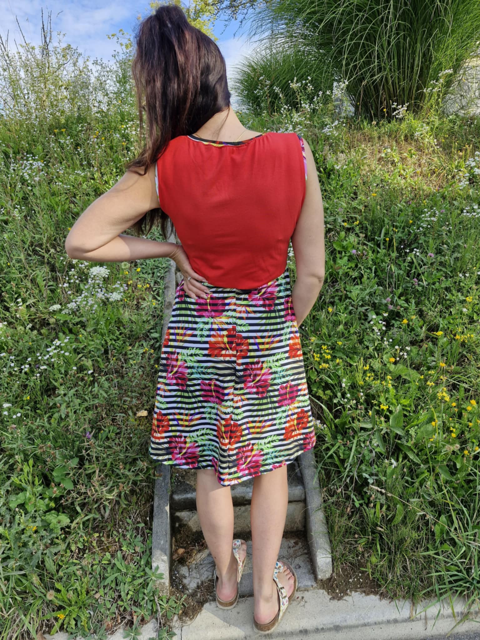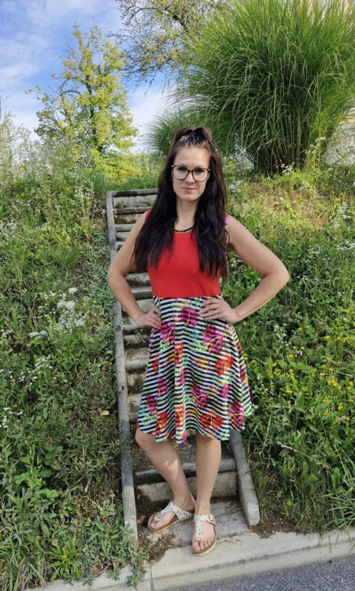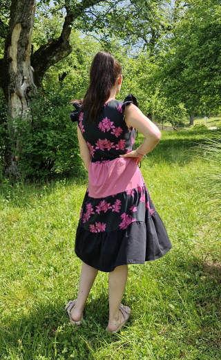 Modna elegantna obleka, narejena iz bombažnega Jerseya. Udobna obleka, ki od pasu prosto pade.