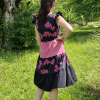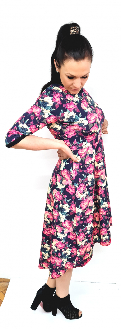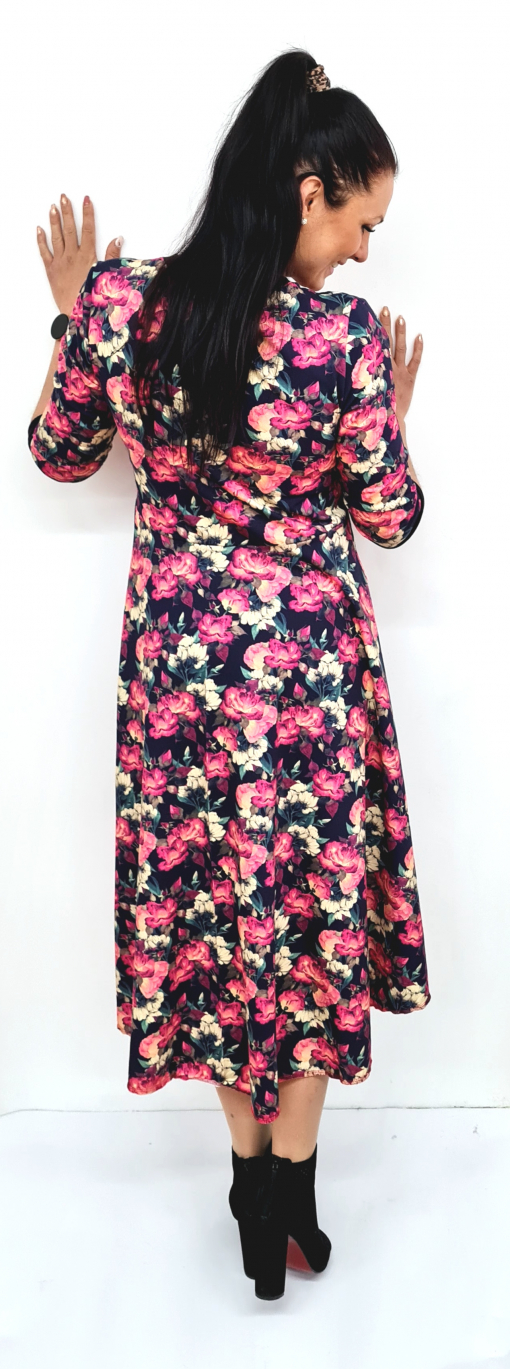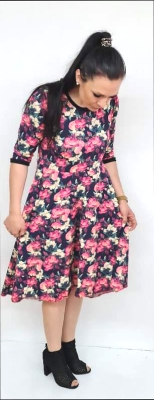 Modna elegantna obleka, narejena iz bombažnega Jerseya. Spredaj sega do kolen zadaj pa je daljša. Udobna obleka, ki od pasu prosto pade, s tem skrije če je kakšen kilogramček preveč.